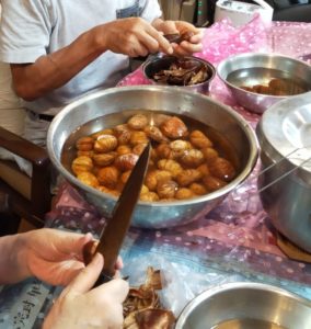 この皮むきの作業はとても大変で、私は少し手伝っただけでも手が痛くなりました。数年前から父も手伝うようになり、大きなピンセットを使って手早く皮を剥きます。