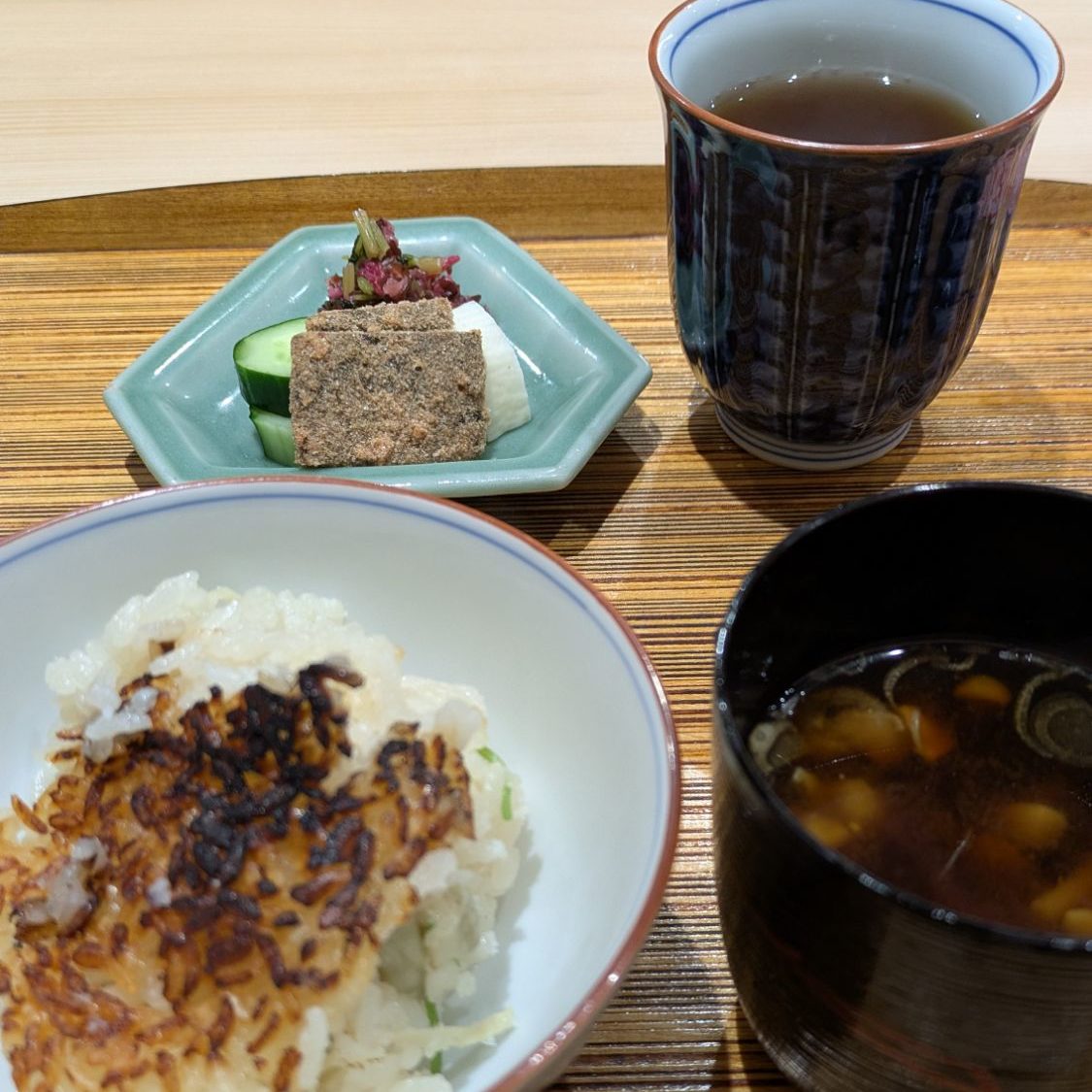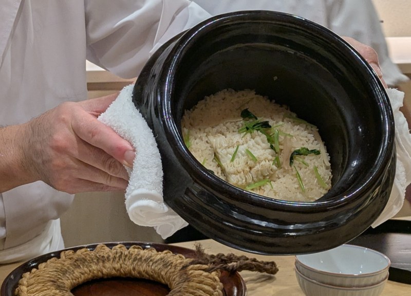 The takikomi gohan (seasoned rice) was ready. I asked to take a photo. Rice cooked in an iron pot develops a delicious crispy layer at the bottom called “okoge.” When I was a child, my sister and I used to fight over the okoge!