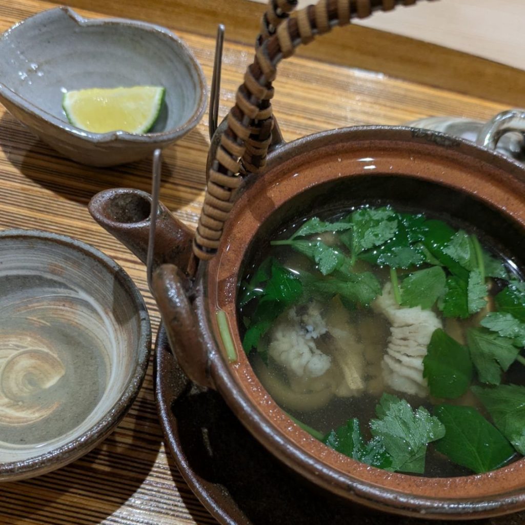 Then came matsutake mushroom dobin-mushi, a traditional broth steamed in a teapot-like vessel. Inside were matsutake mushrooms and hamo (pike conger). The aroma was wonderful!