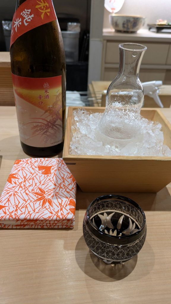 日本料理には、やはり日本酒です。料理人と相談しながら、秋限定の辛口の日本酒をオーダーすると、お猪口を選ばせてくれました。