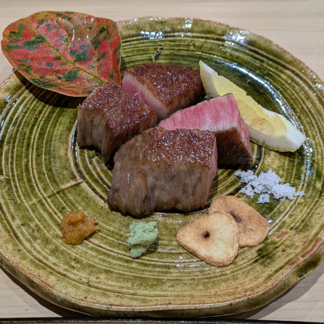 A big piece of meat! It melted in my mouth. The leaf displayed behind it is a persimmon leaf. The chef told me that he personally goes into the mountains to gather the plants used for decoration.