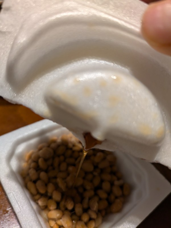 納豆のパッケージの中には、タレが入っています。タレは納豆につかないようにビニールで仕切られています。
