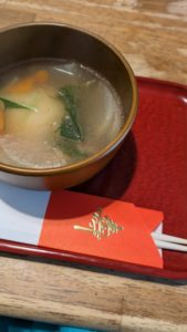 In my hometown of Imabari City, Ehime Prefecture, our ozoni is made with clear soup using dried sardines (iriko) for stock, with daikon radish, carrots, chrysanthemum greens, and chicken. We use round mochi that softens in the soup without being grilled.