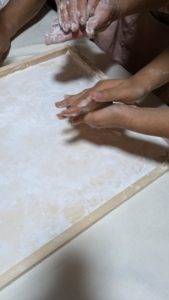 蒸し器で蒸す、杵でつく工程が今は機械で簡単にできます。その間に餅を置く台を準備します。粉をまぶし、台に餅がくっつかないようにします。餅ができあがるまで、シフォンケーキを食べながらおしゃべりタイム🥰